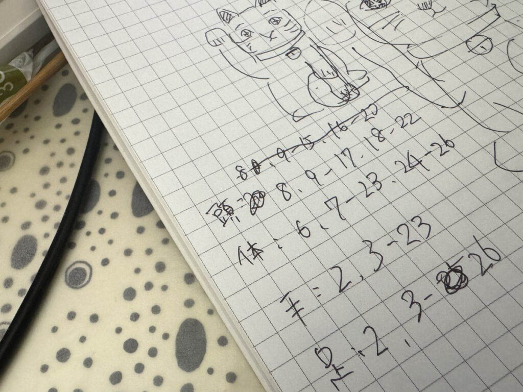 頭、体、手、足パーツに必要な段数をメモにまとめました。